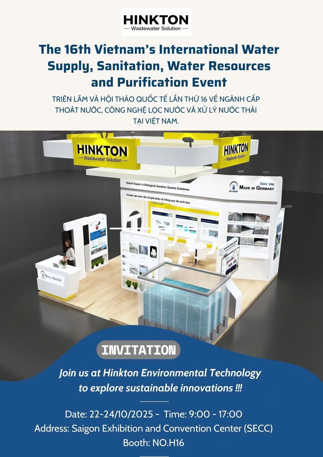HINKTON Environmental TechnologyOctober 22-24, 2025 – HINKTON Environmental Technology will showcase the German OTT GROUP® Aeration System, Spanish Createch360® Precision Aeration Control System, Swiss EGGER® Linear Iris Control Valves, Austrian InDENSE® Sludge Screening System, and the SED Biochemical Process System. We cordially invite you to visit us at Booth H16 in Ho Chi Minh City to explore new pathways of technological innovation and witness the transformative power of environmental technology together.
